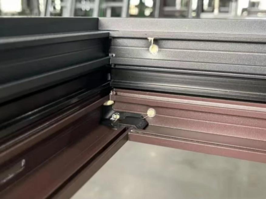 普通斷橋鋁橫梁、立柱連接的時候用螺絲加鋼片,而系統(tǒng)窗會采用注膠的工藝,往型材和角碼之間填充組角膠。