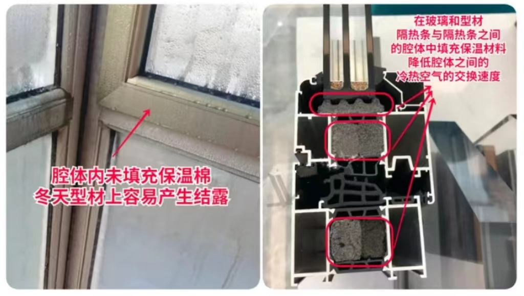 一般會填充聚氨酯發(fā)泡或者是保溫棉,雖然提升不大,但作為高性能是必須的。有的廠家會在每一個腔體都填充,有的話只填充隔熱條腔體,我認(rèn)為只需要填充隔熱條腔體,因?yàn)檫@個地方才是切斷溫度傳導(dǎo)的。